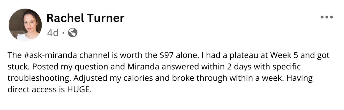 20+ organized channels — find exactly what you need (supply questions, meal ideas, body image support, workout help) without scrolling through chaos