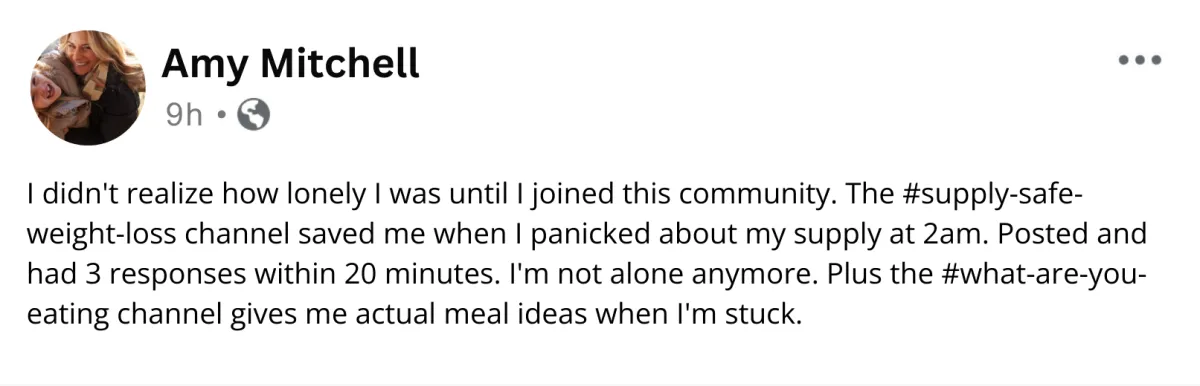 That's okay. Some moms check in daily, some weekly, some just lurk and read. There's no pressure to be super active. Even just reading other moms' questions and wins helps you feel less alone. Participate as much or as little as you want. Plus all Q&A calls are recorded so you can watch when you have time.