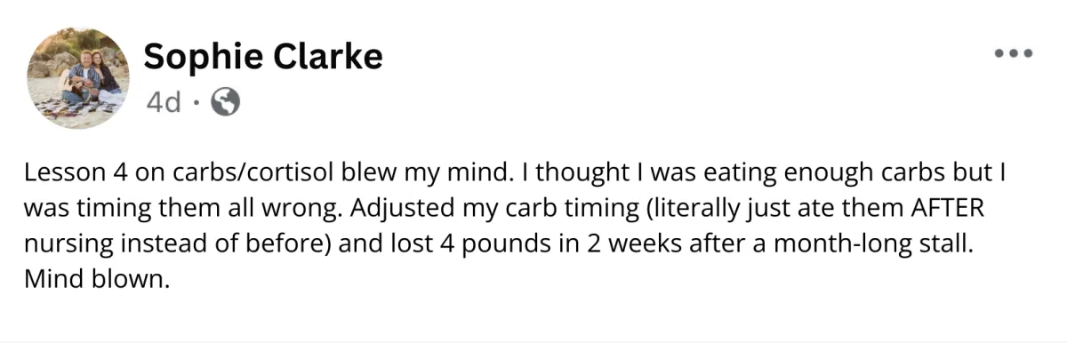 Why many breastfeeding moms are accidentally under-carbing, carb timing that affects supply AND fat loss, signs cortisol is blocking you, simple timing tweaks (no tracking required).