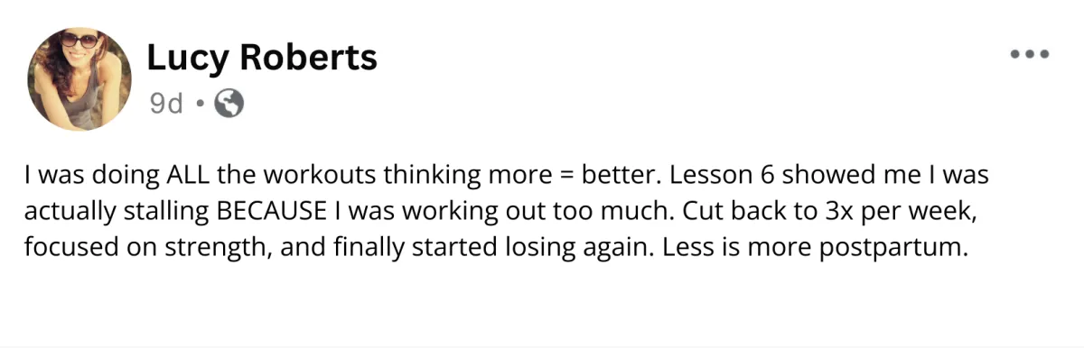 Why more workouts ≠ better results postpartum, when walking helps vs. hurts, strength vs. cardio priority while breastfeeding, signs you're doing too much, how to adjust without adding time.