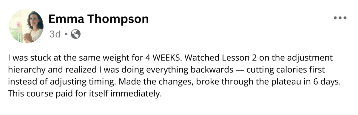 Week 5: Still stuck. You watch Lesson 2 and follow the Adjustment Hierarchy. You adjust carb timing first (not calories).